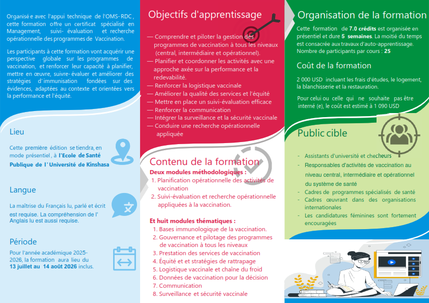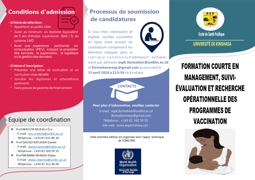 L’École de Santé Publique de l’UNIKIN, avec l’appui de l’OMS, organise une formation courte (5 semaines) en management, suivi-évaluation et recherche opérationnelle des programmes de vaccination.